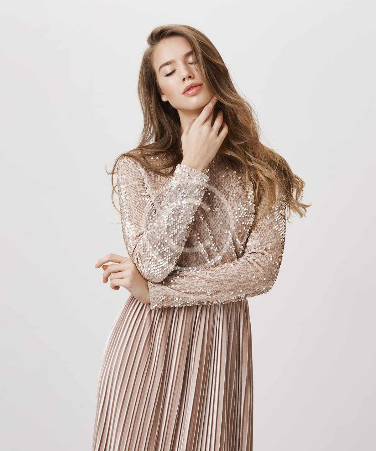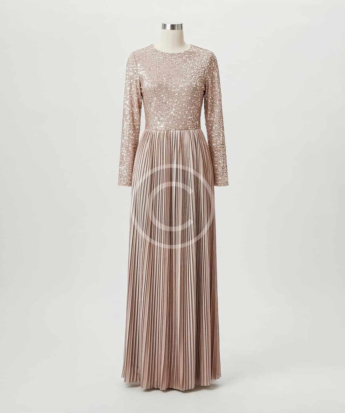This elegant sequin long sleeve dress combines sophistication and glamour, making it an ideal choice for any formal event or special occasion. The dress features a beautifully embroidered sequin bodice that adds a touch of sparkle, while the flowing pleated skirt creates an elegant, graceful silhouette. The long sleeves and high neckline provide modest coverage, while the soft, delicate fabric ensures comfort. Perfect for weddings, galas, or evening events, this dress exudes timeless beauty and luxury.