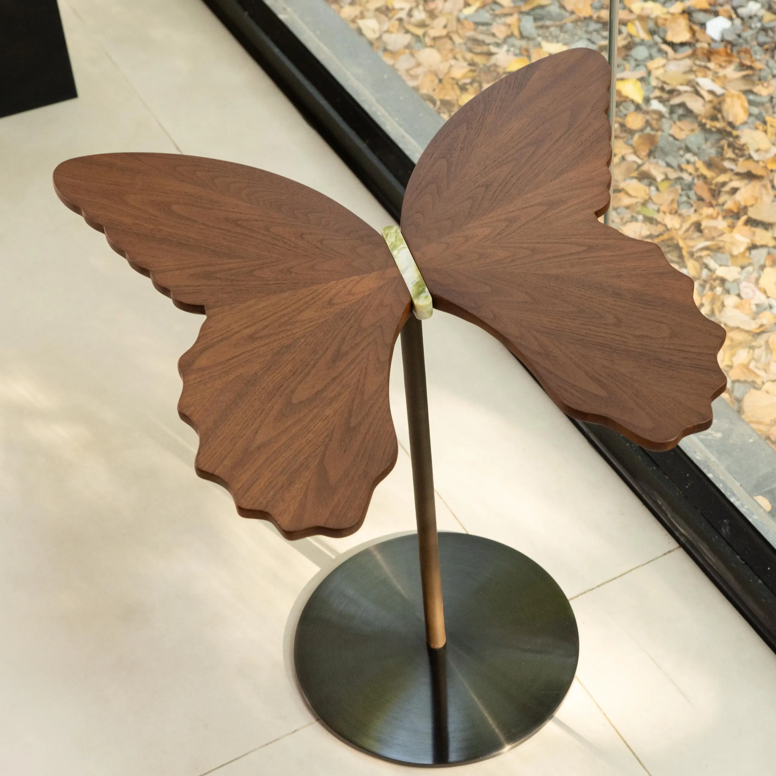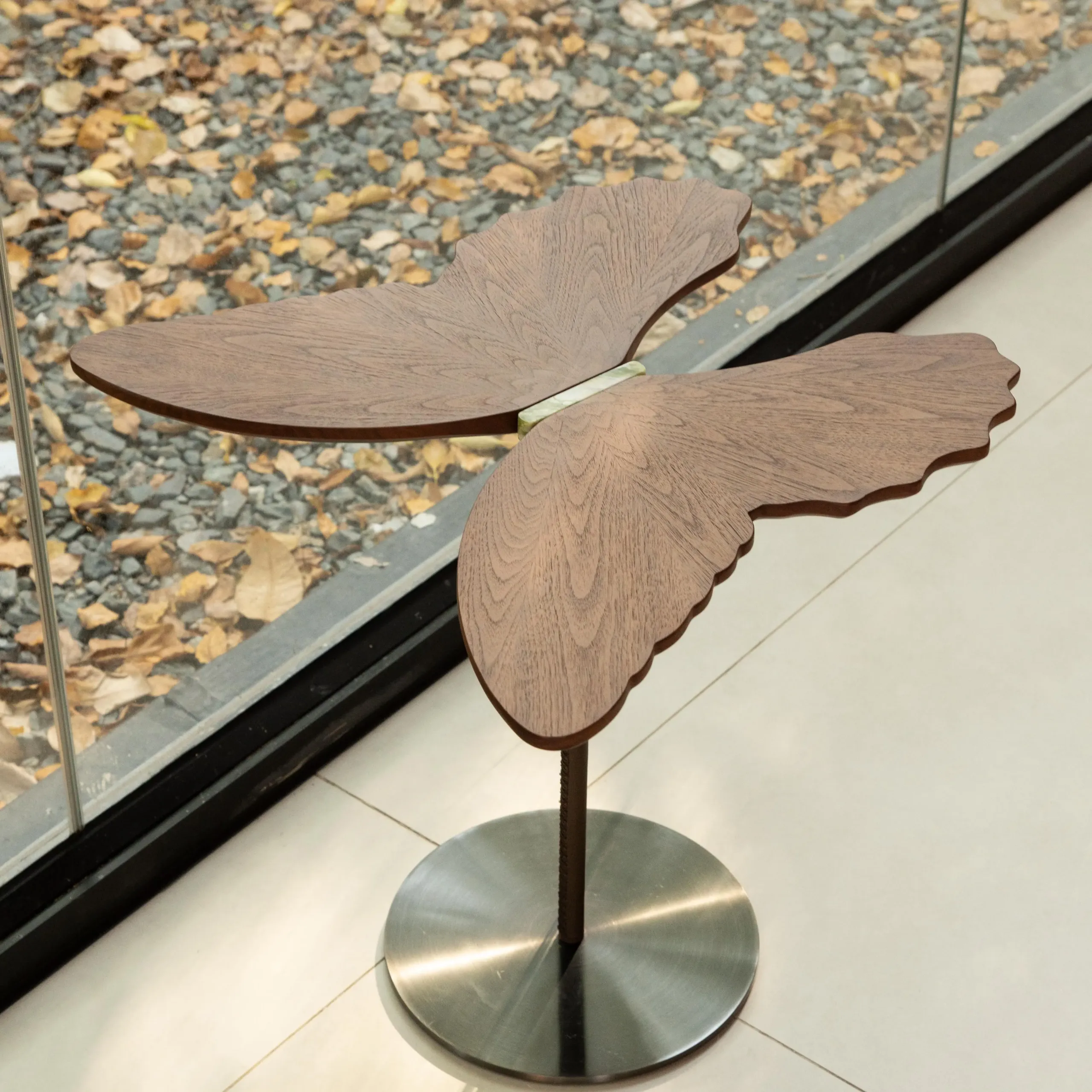 Walnut veneer forms the wings, while Irish Green marble becomes the abstract body—expressing free movement within an ideal lifestyle.