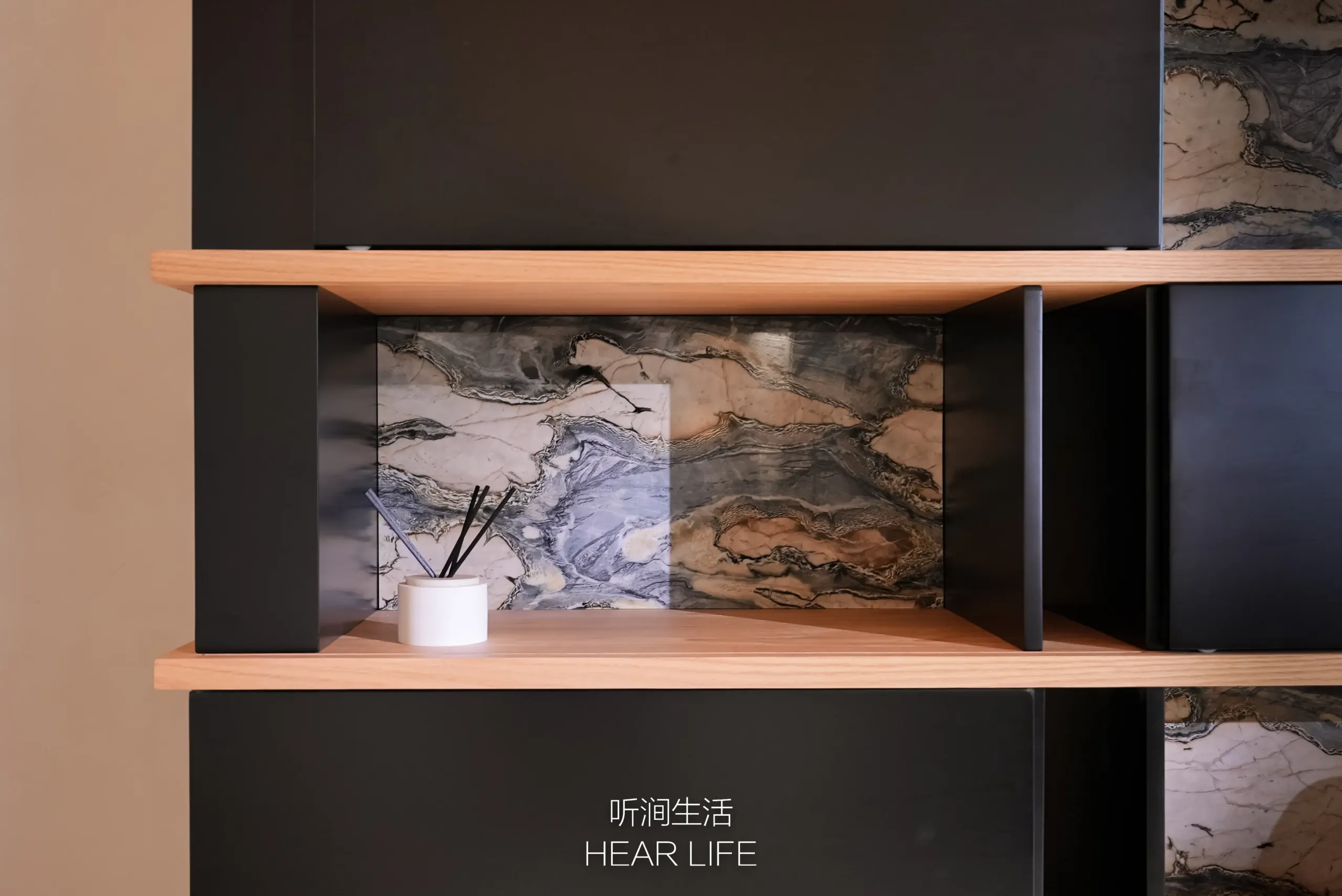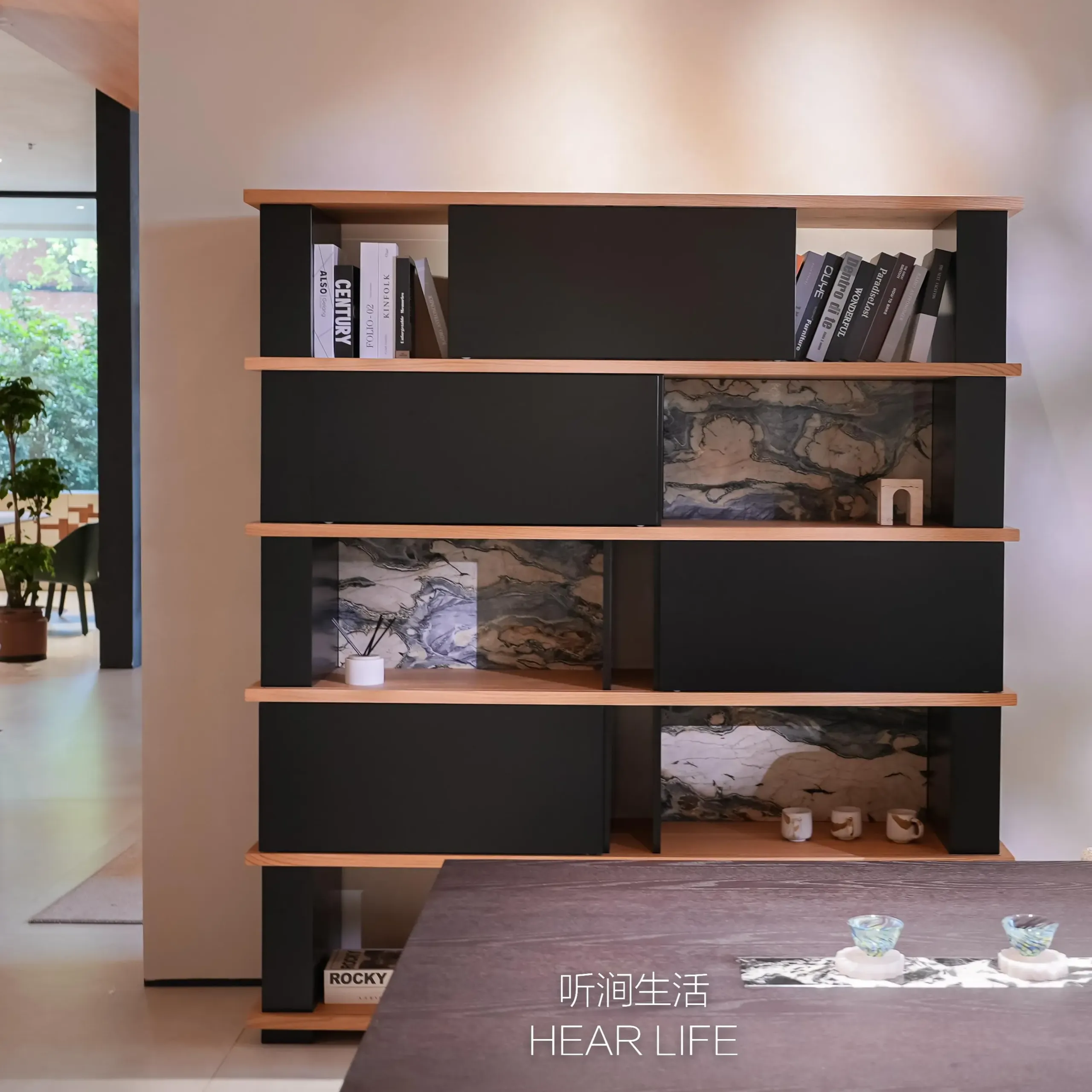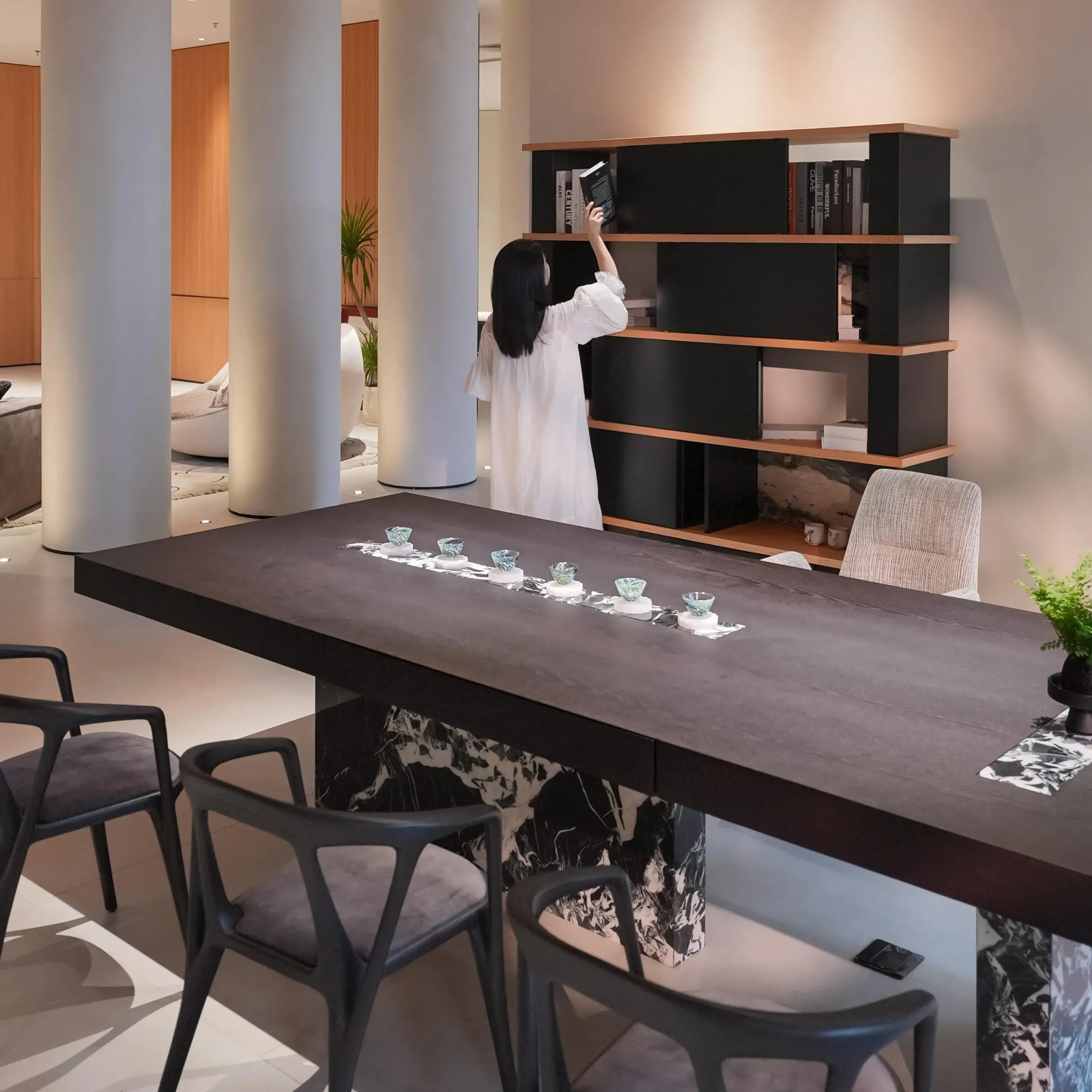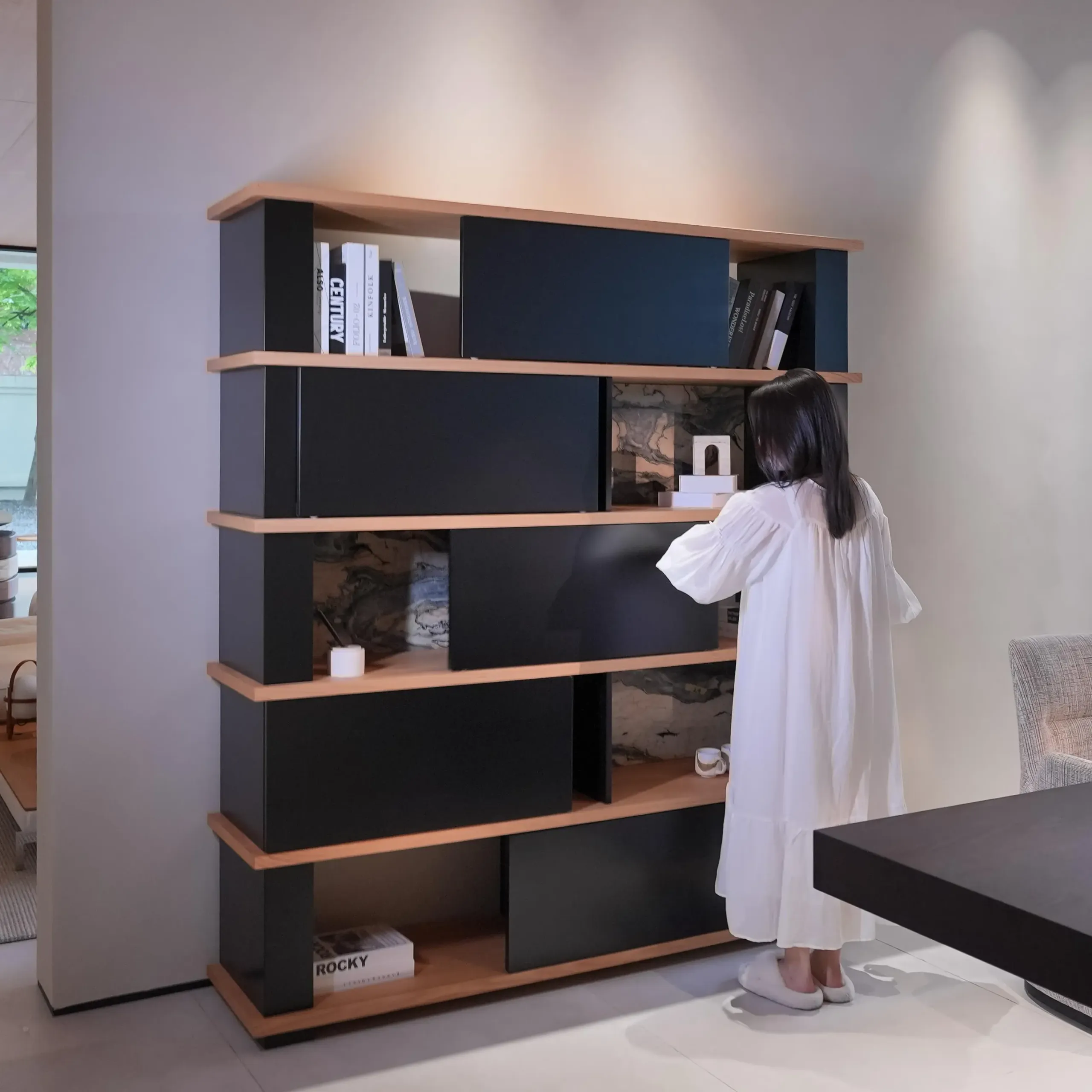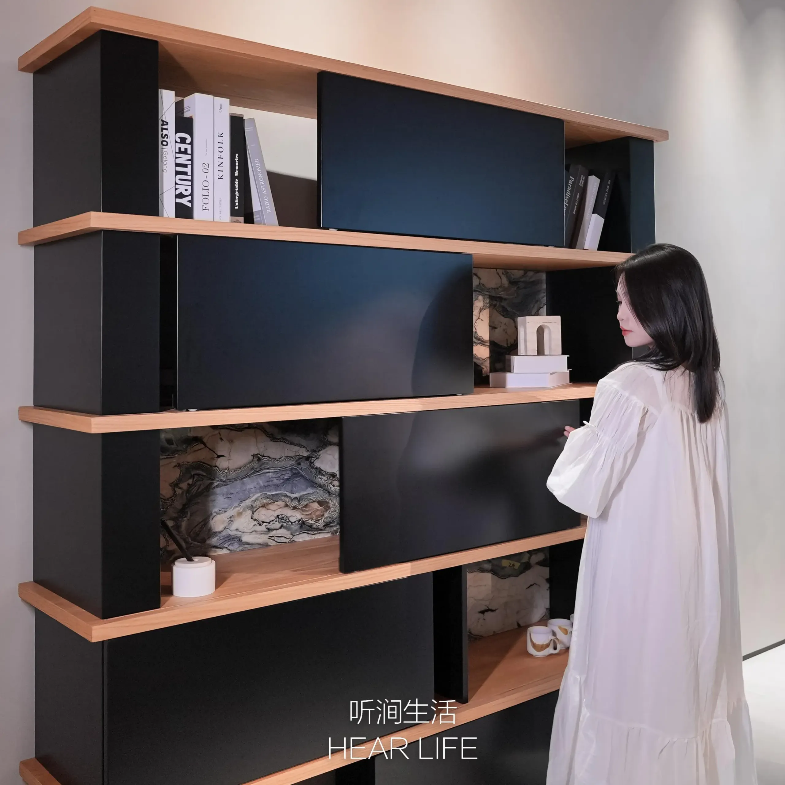 Inspired by classical garden and architectural framing techniques, movable panels create artistic “peek” views against a Van Gogh Starry Sky marble backdrop.