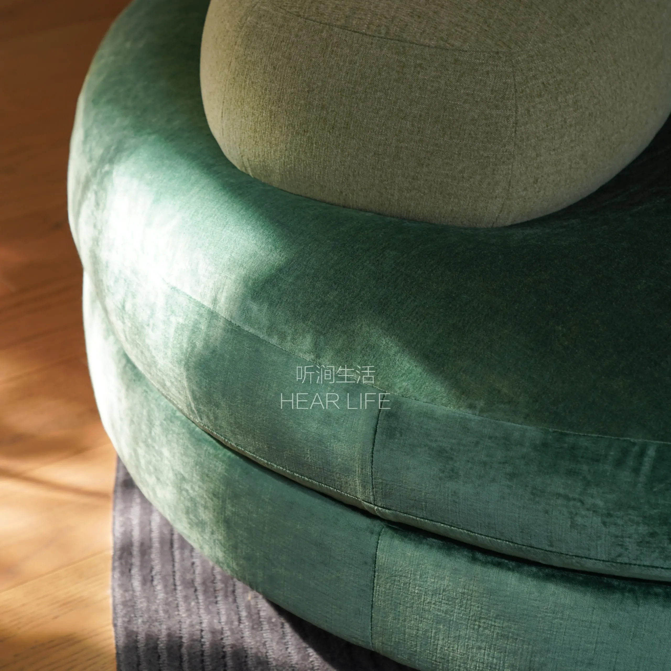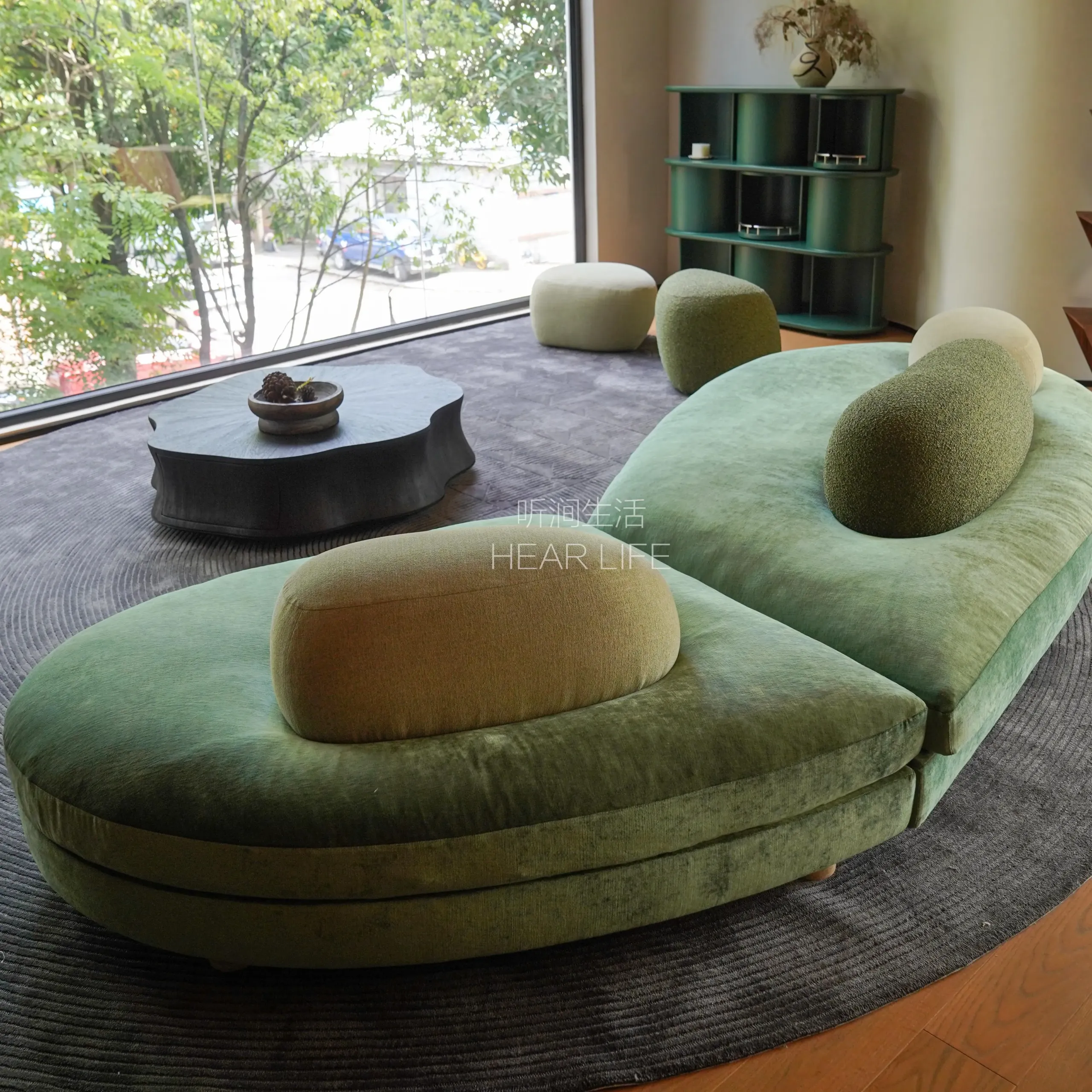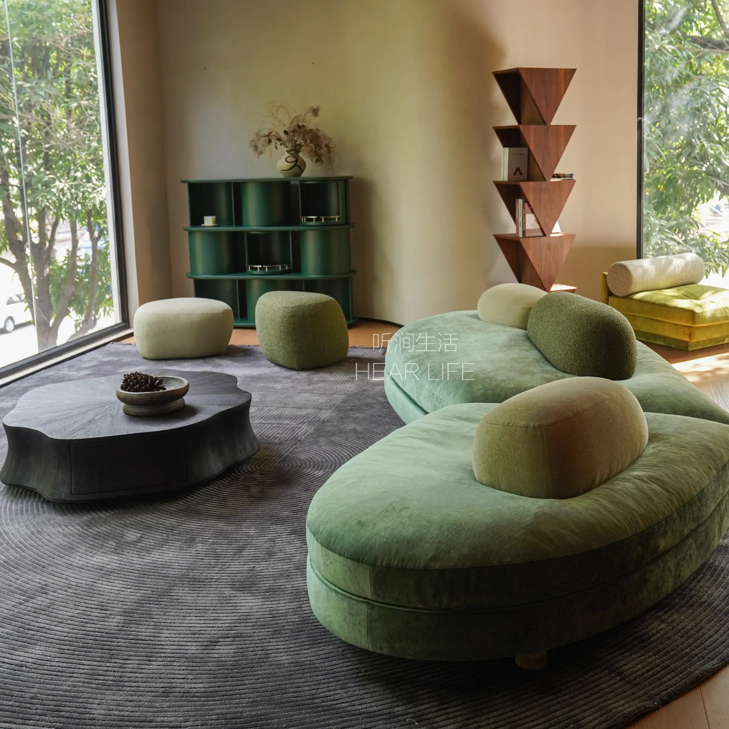 Natural travertine is used for the legs to express solidity and nature, while moss-textured DolceVita fabric cushions represent the softened, melted reef.