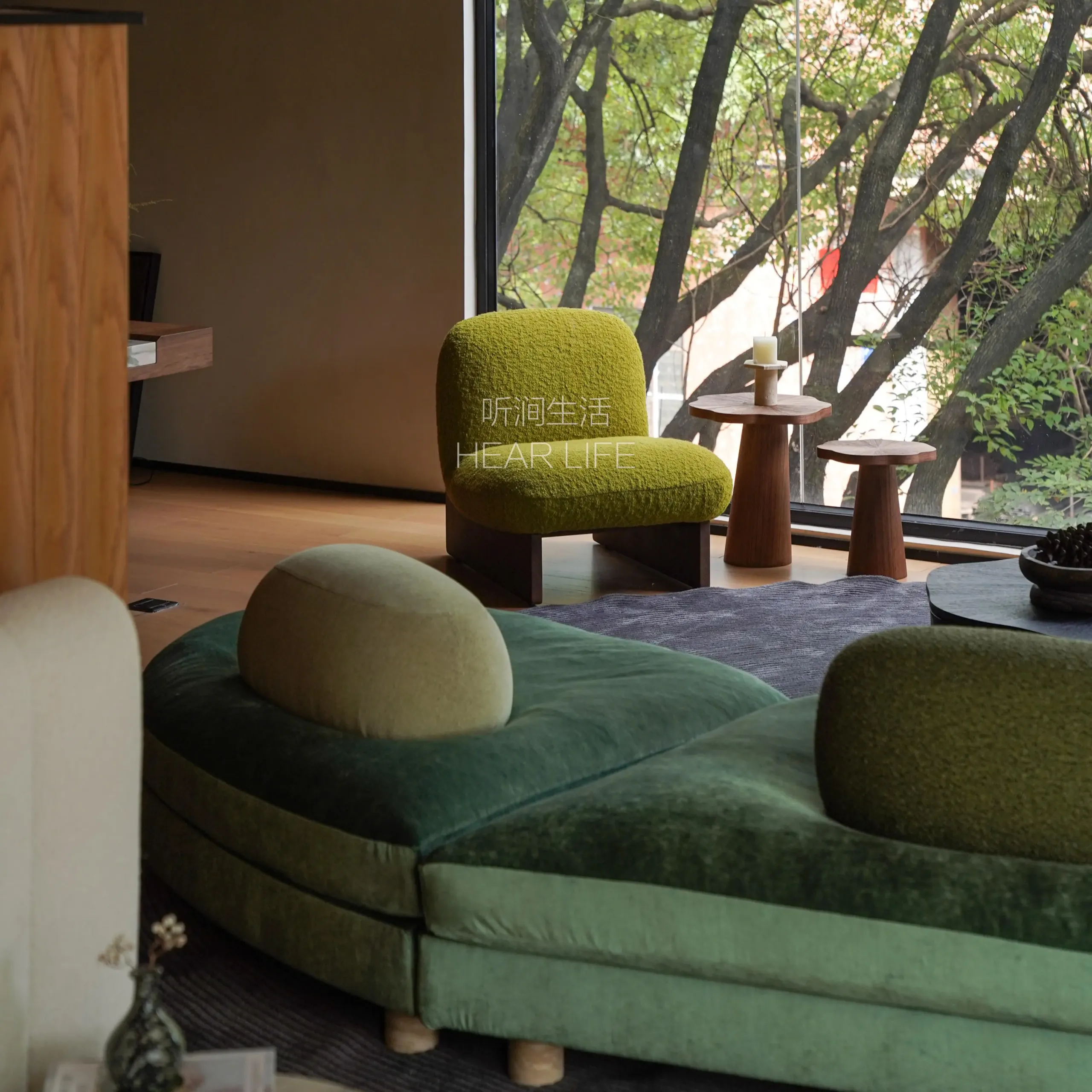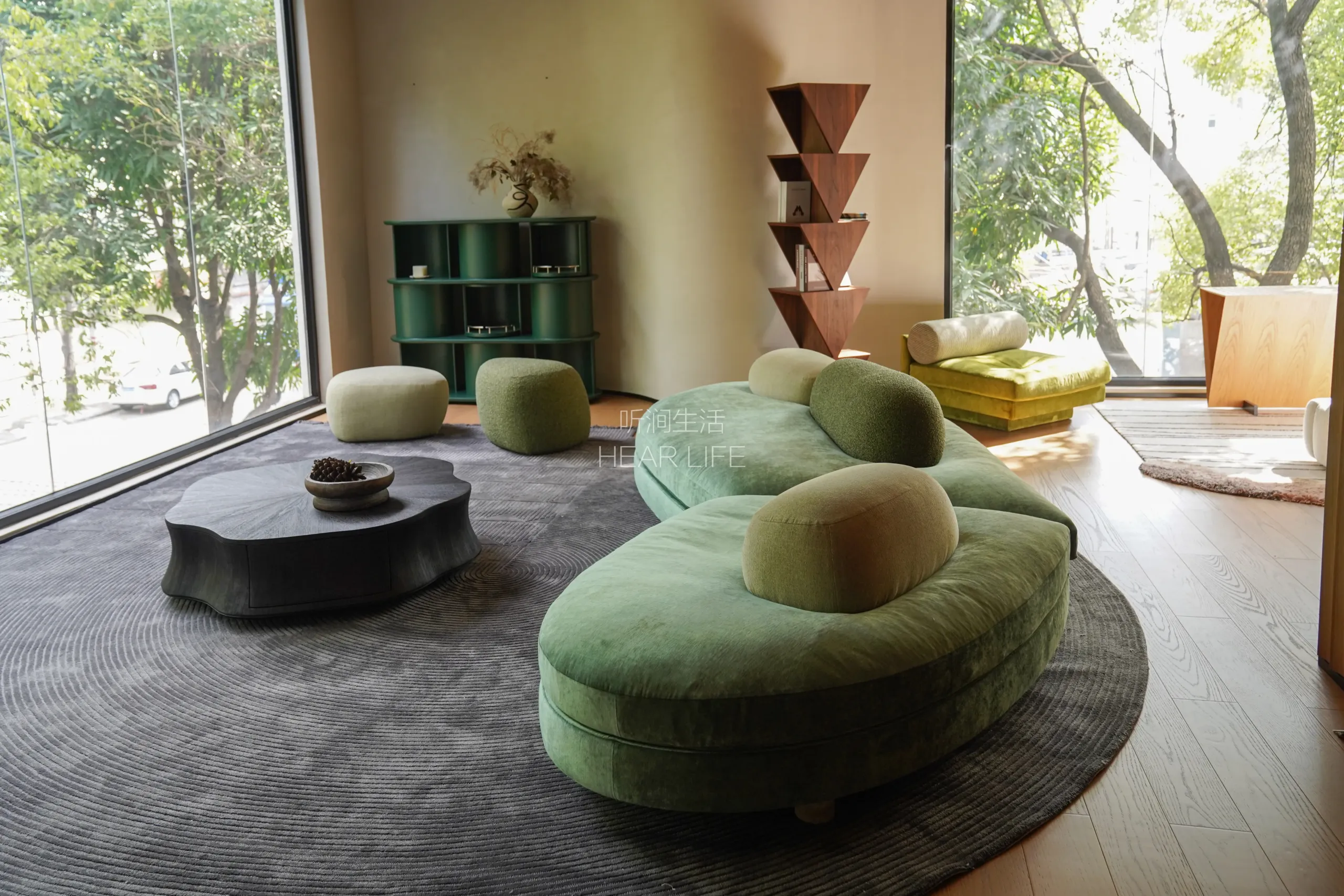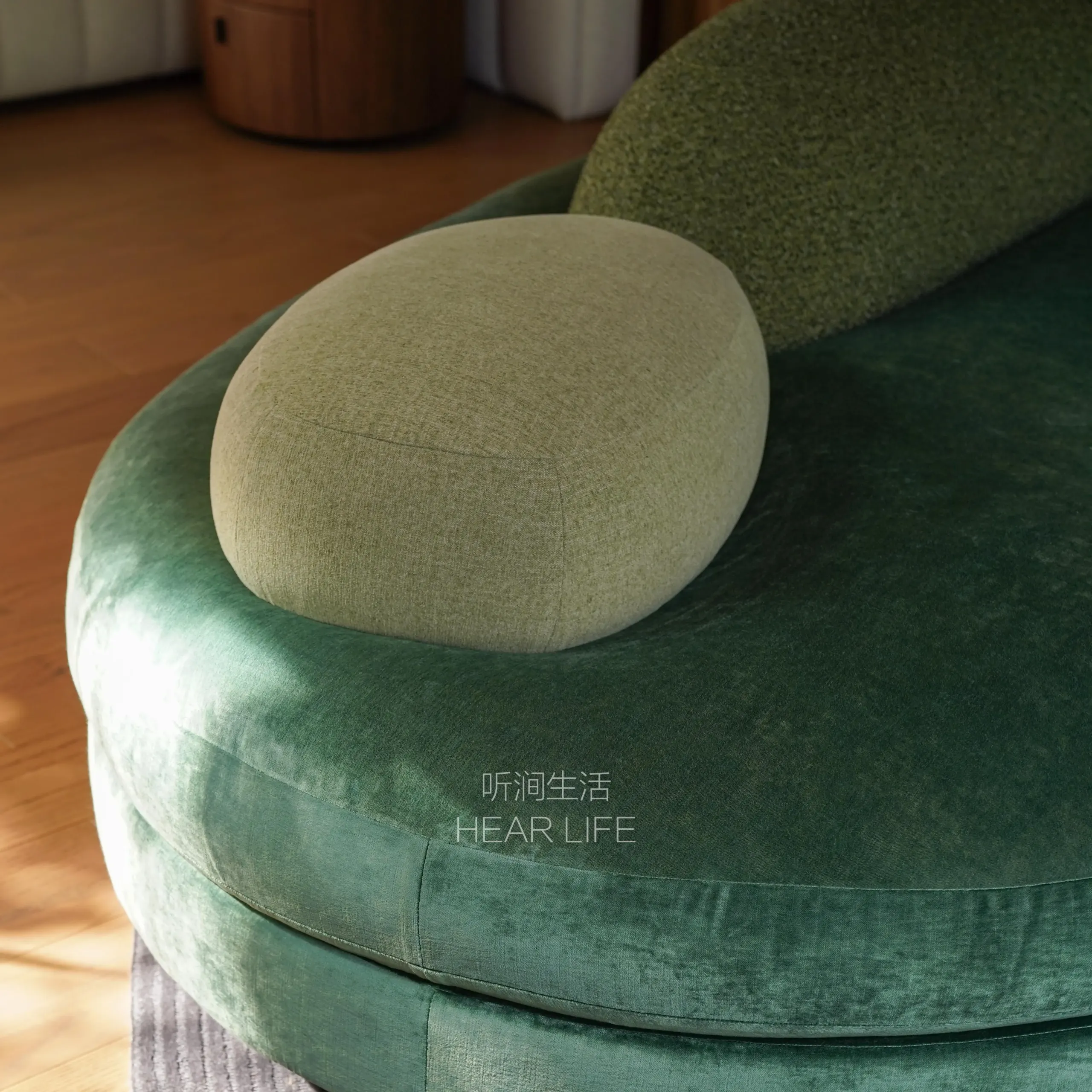 Natural travertine is used for the legs to express solidity and nature, while moss-textured DolceVita fabric cushions represent the softened, melted reef.